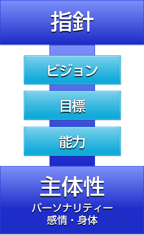 それに対してコーチングとは図表の中身であるビジョンや目標達成や能力育成・活用への支援を行います。目標を設定するに当たってはどのような生き方(指針)をしたいか、また将来どのような夢や構想を持っているかを目標という形に反映し具体化していきます。(指針やビジョンが明確にならなくても目標が設定される場合もある)